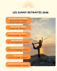 Vous pouvez vous pré-inscrire aux retraites dès à présent en m’envoyant un mail à ghislaine@mysunnyyoga.com (le versement de l’acompte se fera ultérieurement en début d’année).